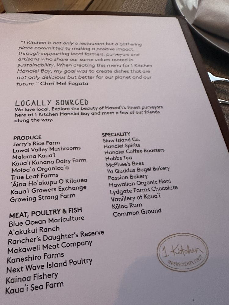 The ambiance is upscale yet inviting, complete with outdoor seating, making it ideal for gatherings. With options for catering and takeout, along with eco-friendly practices like compostable containers, 1 Kitchen Hanalei Bay ensures a delightful and responsible dining experience.